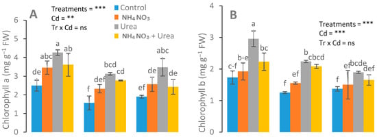 Differential responses of chlorophyll and gas exchange attributes were recorded in urea-treated and NH4NO3-treated plants. Significant changes with the maximum values of Chl a, Chl b, total Chl, and carotenoid contents were observed in the urea-fed plants (Figure 2). A nonsignificant increase in chlorophyll content was observed in the urea-treated plants at 25 mg kg−1 Cd concentrations, in contrast to the NH4NO3-treated and control plants. In addition, a higher expression of gas attributes was recorded in the urea-treated plants than that of the NH4NO3-fed plants (Figure 3).