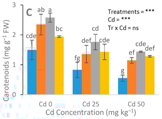 Effects of Cd (0, 25, and 50 mg kg−1) and N fertilizers (ratios of 0:0, 100:0, 0:100, and 50:50 mg kg−1 urea, NH4NO3, and urea + NH4NO3) on chlorophyll a (A), chlorophyll b (B), and carotenoid (C) of S. nigrum. Different letters show a significance difference at p ˂ 0.05 along with n = 4.