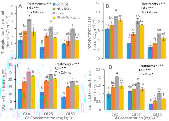 Effects of Cd stress (0, 25, and 50 mg kg−1) and N fertilizers (ratios of 0:0, 100:0, 0:100, and 50:50 mg kg−1 urea, NH4NO3, and urea + NH4NO3) on the transpiration rate (A), photosynthetic rate (B), water-use efficiency (C), and stomata conductance (D) of S. nigrum. Different letters show a significance difference at p ˂ 0.05 along with n = 4.