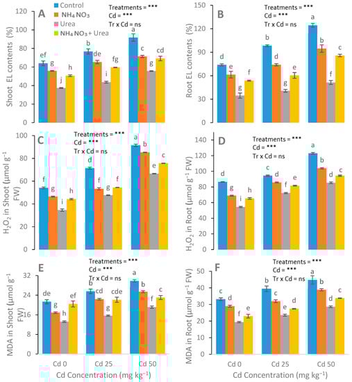 Effect of Cd (0, 25, and 50 mg kg−1) and N fertilizers (ratios of 0:0, 100:0, 0:100, and 50:50 mg kg−1 urea, NH4NO3, and urea + NH4NO3) on electrolyte leakage (EL) in leaves (A), EL in roots (B), H2O2 in leaves (C), H2O2 in roots (D), malondialdehyde (MDA) in leaves (E), and MDA in the roots (F) of S. nigrum. Different letters show a significance difference at p ˂ 0.05 along with n = 4.