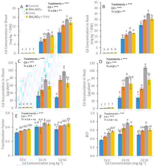 Similar findings were observed for the N fertilizers for the phytoremediation of Cd, and even with different environmental conditions, soil textures, and experimental durations [], and only a few analyses, we acknowledged the possible mechanisms for Cd phytoremediation with detailed analysis in our recent study. In addition, urea-treated plants translocated and accumulated a higher concentration of Cd than the NH4NO3-treated plants. However, the application of N-fertilizers inhibited oxidative damage and enhanced antioxidants’ enzyme activities. Our results depicted that at all levels of applied Cd, the both TF and BCF were enhanced with the application of urea alone, as compared with all other treatments (Figure 6E,F). This shows that among the various treatments, the plants treated with urea alone had greater potential for Cd phytoremediation. In conclusion, the suitable concentration of urea remarkably promoted and assisted the processes of Cd phytoremediation by S. nigrum.