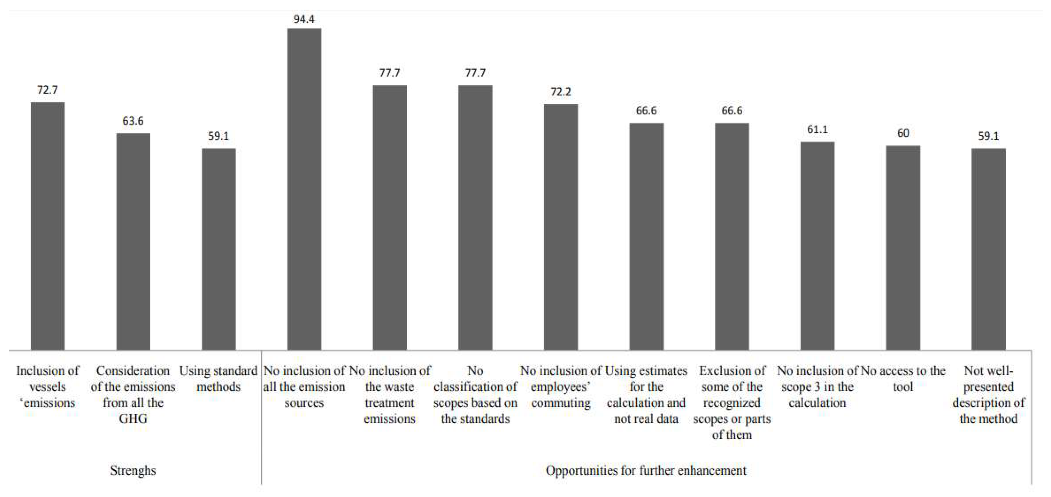 - In almost all of the studies, all the emission sources mentioned in the standard guidelines (direct or indirect) are not calculated. For example, on some occasions, some sources, like emissions from construction equipment or emissions resulting from energy use in rented out buildings are not calculated. In order to obtain comprehensive and realistic figures on GHG emissions and carbon footprint in ports, all emission sources should be taken into account.