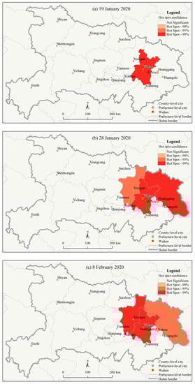 Moreover, it again became a significant hotspot area (the 95% confidence) on 11 February 2020. For the same reason, after 12 February 2020, Xiaogan city became a nonsignificant area compared to Wuhan city. Although the other prefecture cities in Hubei province also had a large number of CCC compared to the other domestic cities in China, they were not significant hotspots due to the oddly high CCC in Wuhan city. The results suggested that Wuhan city was the prefecture city with the most severe and intensive COVID-19 epidemic in Hubei province over the study period and that Huanggang city and Xiaogan city were also among the prefecture cities with the most severe and intensive COVID-19 epidemic in Hubei province for some time. In all, it was found from the prefecture level that Wuhan city had been the most high-risk area, followed by Huanggang city and Xiaogan city, in Hubei province during the initial outbreak and spread of the epidemic.