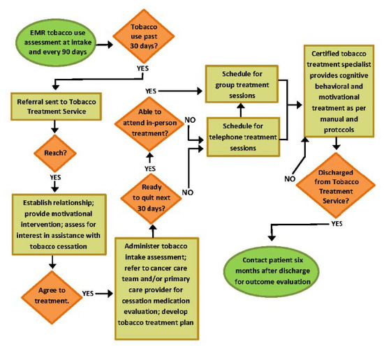 The authors would like to acknowledge the support of the Roswell Park Tobacco Treatment Service development team: Richard Serrano, NCTTP; Brian McDonough, Senior Software Programmer; Andrew Szeliga, Senior Business Systems Analyst; Christopher Dahl, Director, Clinical and Revenue Applications-Information Technology; and Marc Ernstoff, MD, Chair Department of Medicine, Senior Vice President for Clinical Investigation. The support and creativity of these individuals were essential to building the infrastructure and capacity of the Roswell Park Tobacco Treatment Service.