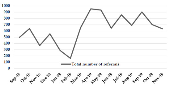 From September 2018 to November 2019 (15 months), the Tobacco Treatment Service received a mean of n = 630 total referrals per month. In the first quarter of 2019, during the transition to the new tobacco use assessment, the number of referrals initially decreased but then increased dramatically. The mean number of monthly referrals from September 2018 to February 2019 was n = 416; the mean number of monthly referrals from March 2019 to November 2019 was n = 773 (see Figure 2).
