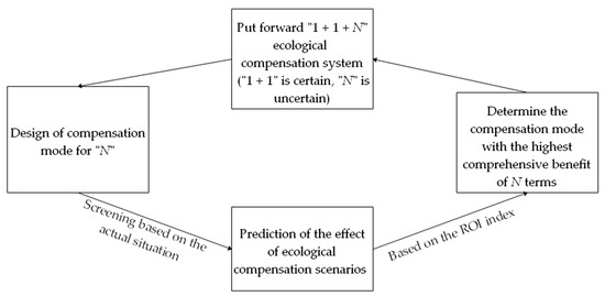 A national park is established and managed by the state. It is the wealth of the entire population as a special ecological environment area. On the basis of the stakeholder and the game theories [45,46], compensation subjects include social citizens besides governments, enterprises, and individuals in the upstream and downstream areas. Considering the relevant requirements of Goals 1, 3, 6, 10, 12, 13, 15, 16 and 17 in the SDGs, this study has built an overall framework in the horizontal and the vertical orientations, set protection as the goal in the horizontal orientation, and explored diversified ecological compensation approaches to improve the efficiency of economic compensation. Sustainable development is considered the goal in the vertical orientation. The fulcrum of social and economic development is innovated to improve the green development mechanism, and the “1 + 1 + N” SDG-based ecological compensation system for basin-type national parks (Figure 1) is established. In this system, “1 + 1” refers to “the vertical transfer payment of government finance” in the horizontal orientation and “the withdrawal of a part of current benefits for technological research” in the vertical orientation. These processes are necessary comprehensive compensation approaches. “N” refers to selective and targeted compensation approaches that should be designed in combination with the actual situation of the research area and can be enriched and expanded from the perspectives of fund, project, technology, material, and policy compensations. In this paper, a new method of green accounting or a new model of green growth for natural resource management are presented on the basis of the design of the compensation model, which is using people’s willingness to pay or market prices to estimate the ecological value of natural resources [47], then different compensation scenarios will be predicted and the benefit will be judged on the basis of the return on investment (ROI) index [48]. The actual expected financial return on the ecological compensation programs is provided to the decision-makers in advance before the values for ecosystem services are obtained, to determine the priority of policy implementation. The specific model work flow chart is shown in Figure 2.
