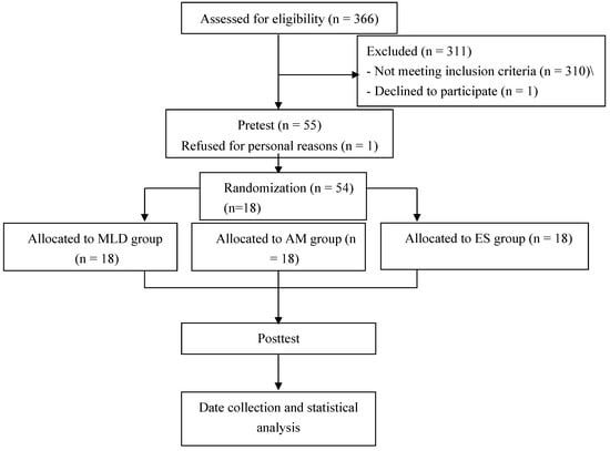 Participants were age and gender matched, then randomly assigned to one of the three interventions: MLD, AM or ES. The frequency and duration of treatment was four-times a week for four weeks, like previous studies [,,,,]. Treatments were performed in a quiet laboratory with the temperature maintained at 22 ℃–24 ℃ to minimize environmental effects on physiological responses. Participants were positioned in supine with a pillow under their knees to reduce lumbar extension and relax the abdomen. Movement and sleeping were avoided. Participants rested for 5 min and then received their assigned treatment for 15 min. Following treatments, participants rested for additional 5-min for a total intervention time of 25 min.