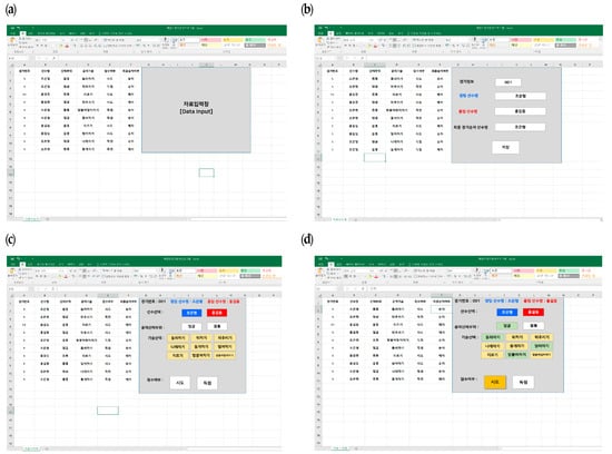 Data input program for Taekwondo. (a) Match Information; (b) Player Identification; (c) Attack target for the skill execution; (d) Outcome of the skill execution