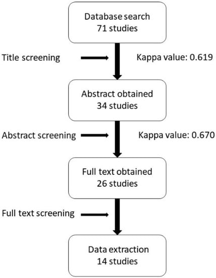 Figure 1 illustrates how 14 studies were selected from the 71 studies initially identified in the electronic search of the period from 2008 to 2018. There were 37 studies excluded from the title screening process for reasons of being reviews, case reports or letters to the editor; reporting on in vitro studies; or being related to early failures only. Screening the Abstracts of the remaining 34 studies resulted in a further 3 articles being excluded for not reporting on implant failures and 5 for not reporting the specific reason for the implant failure. Of the 26 full-text articles assessed by 2 independent reviewers, only 14 studies were finally included in this review [7,12,13,14,15,16,17,18,19,20,21,22,23,24]. Cohen’s kappa values for interexaminer reliability were 0.619 and 0.670 for the title and abstract screening, respectively.
