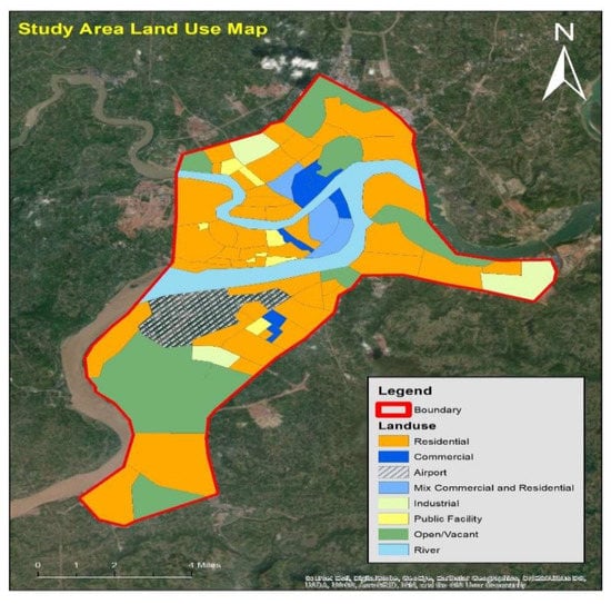 In addition to descriptive statics, hotspot analysis for different violation types is also essential as they provide useful guidance to practitioners and decision-makers to identify sites where specific violation types are more prevailing. This, in turn, allows them to prioritize sites and propose suitable countermeasures to help alleviate the problem of non-compliance. To accomplish the hotspot analysis objective, the study area land use map (shown in Figure 2) was obtained from the city’s municipality. Information on land use is vital to establish a pattern of non-compliance among various city zones. The land use map shown below indicate that entire city area has been zoned into eight different land use i.e., residential, commercial, mixed commercial–residential, industrial, public facilities, open land, zone occupying and surrounding the city airport, and similar zone surrounding the river flow through the heart of the city. More than 60 percent of the area is pure residential with low to medium population density in the city’s suburbs and highly dense areas surrounding the downtown area. The commercial zones are mostly located in north-east directions.