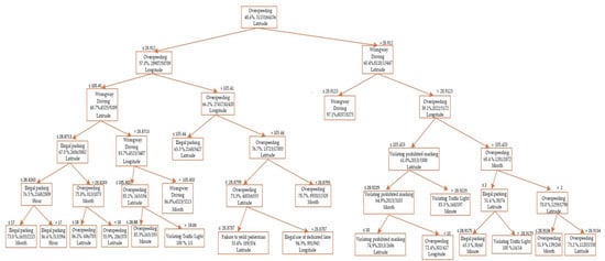 Decision tree (DT) has a powerful capability for the detecting trends in big data sets, and has a non-parametric data mining approach. The aim of using a decision tree is to develop a training model to predict the class or value of the target variable through the easy decision-making rules that can be derived from (previous) training data. Moreover, in DTs, we start from the root of the tree to predict a class label for a record. The root attribute values are further compared to the record’s attribute. Based on the comparison, we follow the branch of this value and jump to the next node. Decision trees classify the instances through sorting the tree from the root to some leaf or terminal node and by providing the instance classification with the leaf node. Every tree node serves as a test case for a particular attribute and the possible answers to the test case correlate with each edge descending from the node. This is a recursive method and repeated for all sub-trees that are rooted in the new node. In addition, the DT parameters include a minimum number of instances in leaves, splitting into smaller subset, maximum number of depths, and stopping the nodes from splitting once the required majority threshold has been reached. The findings are shown in Figure 4 as a tree viewer. The schematic for sequential decision-making during the decision tree algorithm for predicting specific violation type is shown in Figure 4.