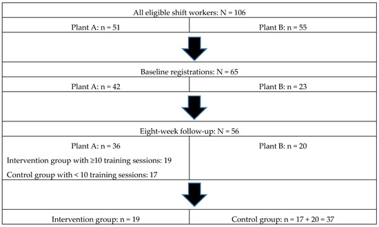 Selection process. 106 shift workers were available for the project, 51 from plant A and 55 from plant B. At project start, 42 shift workers from plant A accepted the invitation with three weekly trainings sessions, with 23 workers from plant B as “activity as usual” controls. At follow-up eight weeks later, 19 participants from the intervention group had participated in at least 10 training sessions and were included in the analyses as intervention group. The remaining 17, who had less than 10 training sessions logged, were put in the control group, together with the 20 workers from plant B, giving 37 in this group.