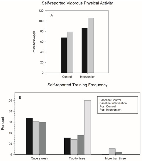 Self-reported training frequency changed during the intervention. At baseline, a majority of the participants trained one or less than one session per week. After the intervention, all members (100%) of the intervention group reported training two to three times a week. The control group members reduced the number that trained one or less than one time per week after intervention and increased the numbers that reported training two or more times per week. Self-reported weekly VPA increased by 11.4 (83.2) min in the control group and 15.6 (116.1) min in the intervention group (Figure 2A,B). We had technical problems evaluating the PAI results, but the intervention group reached an average of 100 PAI per week during the intervention period, statistically significantly more than that of the control group (results not shown).