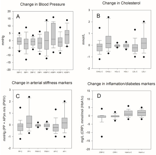 Changes in BP (A), CHO (B), markers of arterial stiffness (C), and (D) markers of inflammation and diabetes from baseline to post-intervention. Horizontal line inside box is median, whiskers are 5 and 95 percentiles, dots outliers. SBP = systolic blood pressure, DBP = diastolic blood pressure, ASBP = aorta systolic blood pressure, ADBP = aorta diastolic blood pressure, PP = pulse pressure, AP = augmented pressure, CRP = C-reactive protein, CHOL = total cholesterol, HDL = high-density lipoprotein, LDL = low-density lipoprotein, HbA1c = glycated hemoglobin, C = control group, I = intervention group. Dots are outliers.