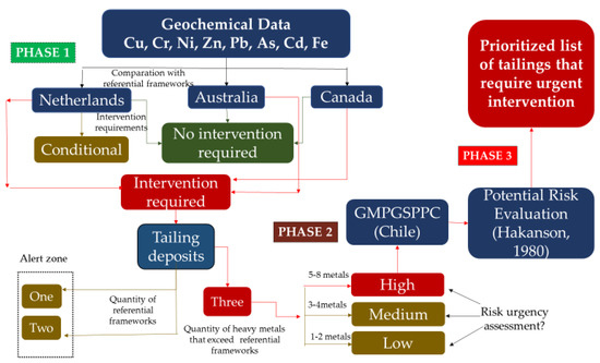 Figure 1 shows the methodology proposed, which consists of three phases. Phase 1: Identifying tailings exceeding the admissibility of the reference concentration values of As, Cd, Cr, Cu, Fe, Ni, Pb, and Zn from the Canadian [26] and Australian [27] guidelines and the Dutch norm [28]. These countries were chosen for the following reasons: (1) The Netherlands is considered as the country with the most experience and development for protecting soil contamination, their norm being the most used in different parts of the world that lack reference values [29,30,31]; (2) Canadian standard values have been used as a reference for soil quality in Chile [9,12]; (3) Australia has climatic and geological characteristics quite similar to Chile [32]. This phase provided a record of tailings whose heavy metal concentration exceeded the values of the three international reference guidelines.