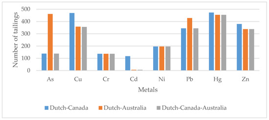 The heavy metal concentration values of the 530 tailings under assessment were parameterized by using Equation (1). These were compared with the Canadian and Australian reference values (Table 1) and the values obtained from the Dutch norm equations (Equations (2)–(4)).