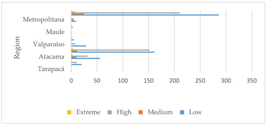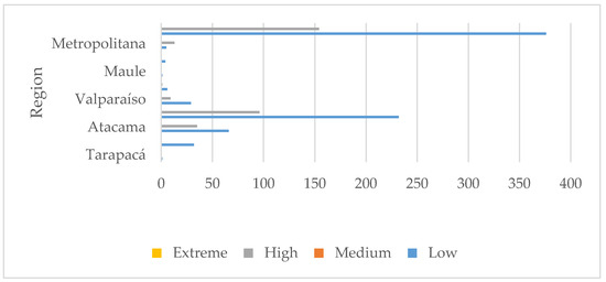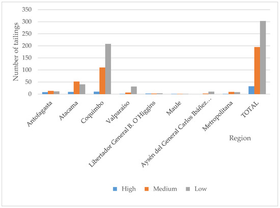 In applying the priority criteria mentioned above to the 530 tailings, 32 of them were classified as “high priority”; 195 as “medium priority”; and 303 as “low priority” for heavy metals. Tailings presenting the highest risks are located in Coquimbo, Atacama, and Antofagasta regions, an obvious fact since the country’s largest mining activity is concentrated in the Chilean northern zone. Figure 3 shows the tailings’ regional distribution.