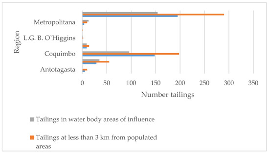 The assessment showed that there are 32 tailings classified as “high priority” due to heavy metal concentration, 195 due to closeness to populated areas, and 154 for closeness to water bodies. Figure 6 shows the results of the 530 tailings assessed, according to the number of heavy metals exceeding maximum values and closeness to populated areas by region. Figure 7 shows the results considering heavy metals and closeness to water bodies. Figure 6 shows tailings classified as “extreme”; that is, they present two critical characteristics: (1) the number of heavy metals exceeding maximum reference values is 5 or more, while (2) closeness to populated areas is smaller than 2 km. On the contrary, Figure 7 does not show any “extreme” tailings, indicating that, at the most, the heavy metals exceeding maximum values are 4.