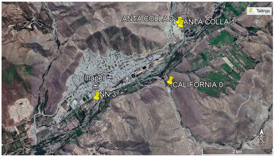 Hakanson’s methodology [14] was used to determine metals that are environmentally risky. To do this, soil background values are needed (Cu 134.7 g t−1; Cr 20.66 g t−1; Ni 50.68 g t−1; Zn 99.27 g t−1; Pb 7.881 g t−1; As 2.30 g t−1; Cd 1.508 g t−1; Hg 0.14 g t−1). The analysis using Hakanson’s methodology revealed that the five deposits identified as Anta Colla 1, Anta Colla 2, California 0, Esperanza Dos, and NN3 show high potential ecological risk indexes (RIs) greater than 320 and, therefore, are qualified as “showing extremely high ecological risk”, according to the criteria in Table 3. Figure 8 shows the location of four of them.
