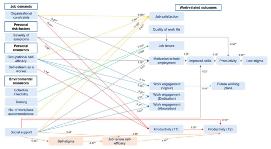 - Villotti, P.; Corbiere, M.; Dewa, C.S.; Fraccaroli, F.; Sultan-Taieb, H.; Zaniboni, S.; Lecomte, T. A serial mediation model of workplace social support on work productivity: The role of self-stigma and job tenure self-efficacy in people with severe mental disorders. Disabil. Rehabil. 2018, 40, 3113–3119. [Google Scholar] [CrossRef]