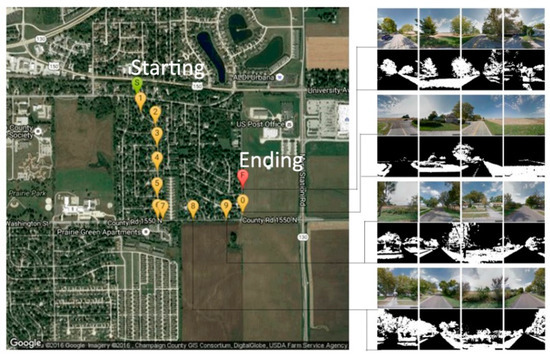 To measure vegetation concentration, we used street view images extracted by Google Map along participants’ daily routes. Each participant reported the three most frequently used routes they took in a typical day. Street view images were downloaded along the routes every 20 m. We downloaded 4 images—facing north, east, south, and west—every 20-m along the route (Figure 1).