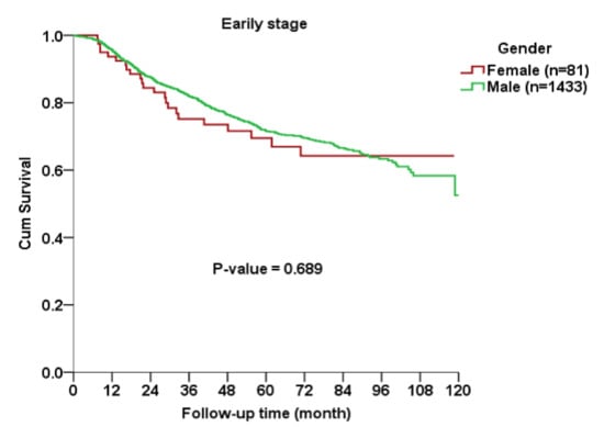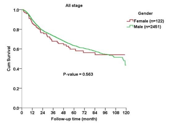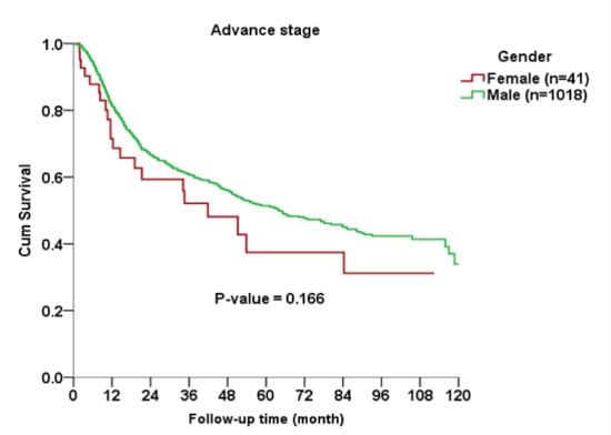 The Kaplan–Meier curve indicated no significant gender difference in OS among all AJCC stages (p = 0.563), early stage (p = 0.689) or advanced stage (p = 0.166) subgroups between cases and controls (Figure 1, Figure 2 and Figure 3).