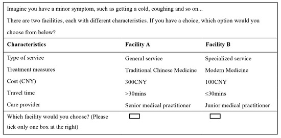APA StyleJia, E., Gu, Y., Peng, Y., Li, X., Shen, X., Jiang, M., & Xiong, J. (2020). Preferences of Patients with Non-Communicable Diseases for Primary Healthcare Facilities: A Discrete Choice Experiment in Wuhan, China. International Journal of Environmental Research and Public Health, 17(11), 3987. https://doi.org/10.3390/ijerph17113987