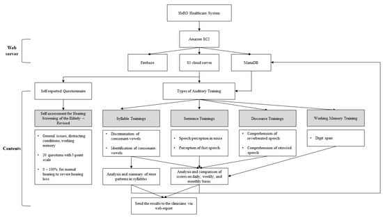 Framework of HeRO healthcare mobile application including web server parts and key contents, which consists of one self-questionnaire and four types of auditory training. It sends a summary of the training results to the clinician and provides feedback to the users (trainees) from the clinician as interactive communication.