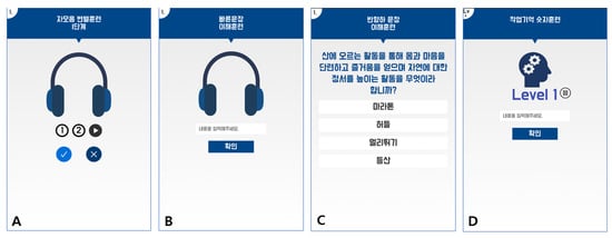 Image examples of the developed HeRO healthcare mobile application for four types of auditory training in the present study: (A) syllable training, (B) sentence training, (C) discourse training and (D) working memory.