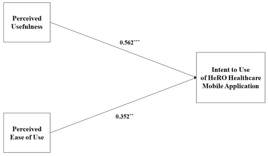 Path analysis of HeRO healthcare mobile application likelihood of use based on multiple regression model. * p < 0.05, ** p < 0.01, *** p < 0.001.