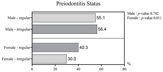 In this paper, the prevalence of periodontitis according to the work pattern differed between men and women over 50. Although not statistically significant, the prevalence of periodontitis in men was somewhat lower in the regular working pattern group. (55.1% vs. 56.4%, p = 0.742; Figure 2).