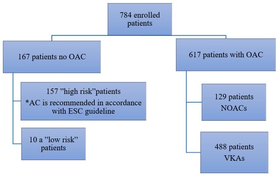 In the timeframe allocated for recruitment, we initially assessed a number of 835 patients for eligibility. Fifty-one patients were subsequently excluded from the initial number, due to the lack of available data. Our study enrolled 784 patients from which 167 patients (21.3%) had no OAC in their treatment and 617 patients had OAC; 488 (62.2%) of the 627 received VKAs and 129 (16.5%) received NOACs (Figure 1).