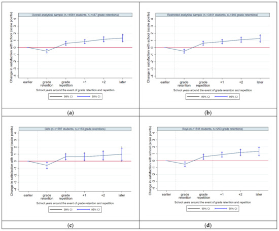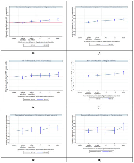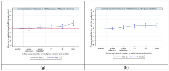 For boys, we expect that well-being does not change in the year of grade retention decision and grade repetition, because they do not care as much about school as girls and experience a grade repetition more frequently. Male students may not perceive a grade repetition in terms of a critical event that could affect their well-being.
