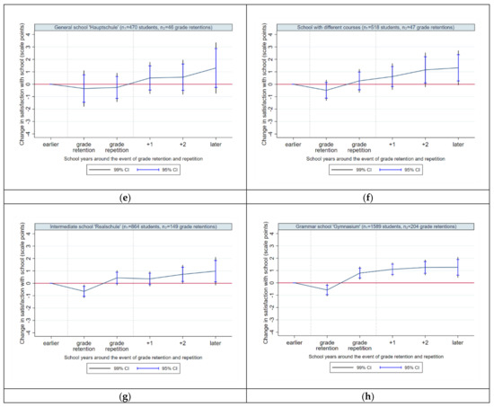 As in the case of gender, there is scarce evidence on the effect of grade repetition on well-being among students attending different types of school. Previous studies examined differences in well-being between school types in a more generalized manner. They showed that students in school types other than grammar school (i.e., Gymnasium), such as general schools, reported lower well-being on average than grammar school students [37,47]. In addition, the likelihood and frequencies of grade retention differ strongly between school types [11], showing that students attending other school types than grammar school experience more frequently a grade retention and repetition. Even though we observe an increase in participation in education and higher qualification in the era of educational expansion in Germany, there are still social inequalities with regard to the transition to schools with higher educational standards, because it is still linked to the social background of parents [66]. As educational aspirations of parents with students attending grammar schools are likely to be higher, it is reasonable to assume that the impact of grade retention and repetition on well-being among students in grammar schools turns out to be more negative compared to the well-being of students in other school types. In line with this, prior findings revealed that grammar school students often show stronger performance orientation and educational demands [67]. Furthermore, because the frequency of experiencing grade repetition in grammar schools is the lowest, one can assume that this event may more negatively affect grammar students´ well-being. In contrast, students in general schools in Germany are more likely to have parents with a lower educational background and, thus, will be from a lower socio-economic background compared to students from grammar schools [2]. Intermediate schools and schools with different tracks are more heterogeneous in the composition of students with regard to these characteristics [2]. In addition, school types other than grammar schools are more often confronted with a classroom climate that is less conducive to learning [2] and attended by students from more heterogeneous socio-economic backgrounds, which in turn has an impact on the learning atmosphere, classroom climate and shared values such as the experience of a grade repetition.