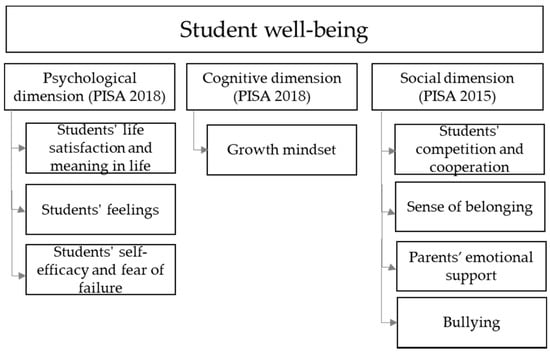 Based on that definition, in the 2015 edition of PISA the framework for the analysis of student well-being described the construct according to five domains [6]: (1) cognitive well-being, which includes variables related to student knowledge and abilities for resolving everyday issues; (2) psychological well-being, which includes perceptions of the students about their own lives, their engagement with school, and their plans for the future; (3) physical well-being, which refers to students’ health and their habits related to sports and eating; (4) social well-being, which evaluates how students perceive their relationships within and outside of school; and (5) material well-being, which refers to the available resources for meeting students’ needs.