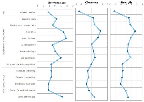 Figure 3 shows the centrality indexes for the well-being network. The perception of higher self-efficacy, or resilience, is the node with the highest influence over the others. This variable has the highest strength centrality; in other words, it has strong direct connections with many nodes. It also demonstrates the highest value of closeness centrality, as the direct and indirect paths that connect it to other variables are relatively short, which means that it is more vulnerable to changes in the other variables. Fear of failure is another node with high levels of centrality and demonstrates the greatest betweenness centrality, as it lies on the shortest paths between other nodes. In line with the conclusions resulting from Figure 2, life satisfaction and a sense of belonging also have important roles in moderating the well-being network.