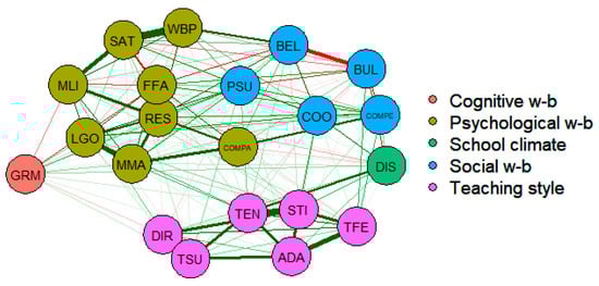The network approach allows the representation of interactions between the elements of the phenomena and lets us understand the structures and consequences of these interactions. It allows us to interpret the relationship between different elements simultaneously, the underlying reciprocal influence, and interconnections [24,35]. Network analysis pursues two types of hypotheses: those that seek to understand the cause of the formation of determinant interactions in a given population, and those that aim to discover how the interaction of the elements influences the outcomes [36]. In the present study, the network analysis was based on both premises; first, we studied the relationship between the well-being variables and then we investigated the influence of school factors on these relationships.