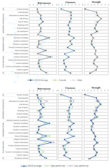 Figure 5 shows the centrality indexes for the variables making up the proposed network models. The values are presented for the OECD average, as well as for the population subgroups—female and male students—and high and low performers.