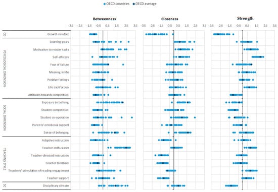 Student resilience in terms of self-efficacy was a central area in the psychological dimension of the well-being network. In PISA, the resilience or ability of a living being to adapt to a disruptive agent or an adverse situation or state [45] is measured through students’ perceptions about their self-efficacy in general competences. Students who believe in their abilities in spite of adversities are also highly motivated, persistent, and enjoy working hard. These observations are in line with previous studies, highlighting that resilient students are self-confident, autonomous, and demonstrate high levels of self-control [46,47]. They are ambitious and satisfied with their lives, reporting that their life has satisfactory meaning. Among the OECD countries, greater self-efficacy was also associated with higher performance in reading, especially between countries performing below the OECD average [4]. Moreover, resilient students are less likely to be afraid of failure.