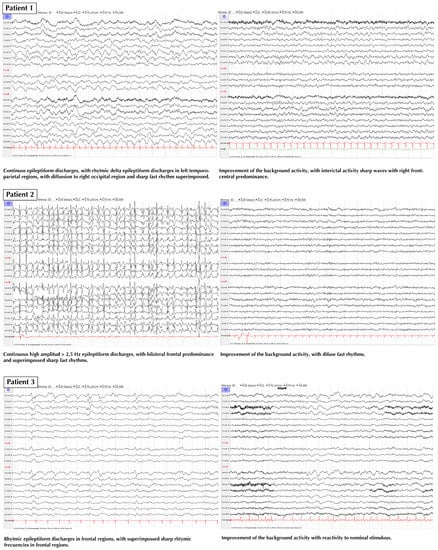 We report all the cases that were treated with ECT at our center, attempting to avoid the bias of anecdotal reports where only successful cases are reported. The cases are briefly summarized, and a description of their treatment is presented in Figure 1. Two representative EEGs of each patient (just before the first ECT session and the day after the last session) are presented in Figure 2 and in a bigger format in supplementary material (Figure S1).