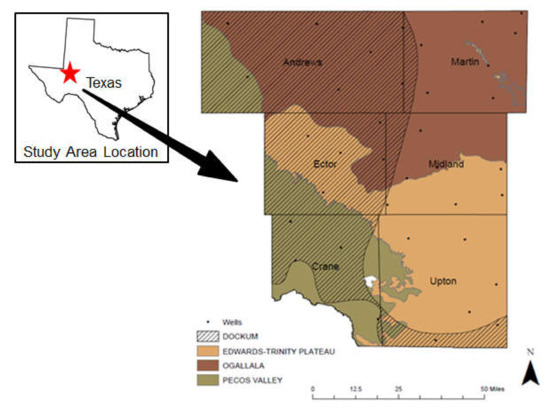 The study area is located in Western Texas which has a total area of 538.98 km2. It extends across six counties of Texas: Andrews, Martin, Ector, Midland, Crane, and Upton (Figure 1). The land cover of the study area consists mostly of developed, barren, bush, grass, and crop. The alluvial environment in which the sediments were deposited consisted of interbedded sand, silt, clay, and gravel filling prehistoric river valleys [16]. Deposition of this aquifer began during the late Miocene to the early Pliocene and formed from eastward flowing streams originating from the Rocky Mountains [13].