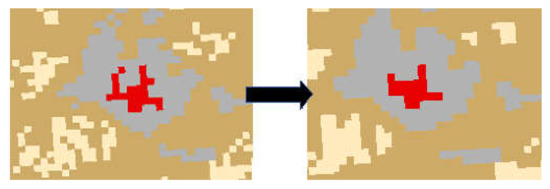 For both images to fit inside the study area, an extract by mask process was performed. This process extracts the raster cells of the imagery data and places them within the county boundaries of the study area. Additionally, we applied spatial analyses to refine the data and identify issues including edge effect, resolution change artifacts, and misclassification (Figure 3). A majority filter was selected to smooth spatial anomalies and to provide a smoother and clearer image [21].