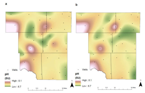 The unconfined Ogallala aquifer contains the highest concentrations of arsenic where levels reach 45.5 µg/L (2006–2019) in northeast Martin County (Figure 10). Between the two separate time intervals, pH begins to shift to becoming more acidic within Northeast Midland County and Southeast Martin County. This shift resulted in a decrease in the mobility of pH and disrupted further release of arsenic in groundwater. Water quality improved between the two different time intervals within the city of Midland from 23.87 µg/L in 1992–2005 to 17.02 µg/L in 2006-2019. Furthermore, as pH or alkalinity increased in Northeast Martin County, the concentration levels remained consistent, resulting from mobility of arsenic in the subsurface.