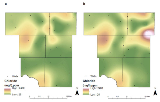 Spatial distribution of chloride in the study area for (a) 1992–2005 and (b) 2006–2019.