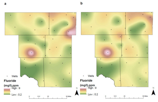 Fluoride (F) is essential for the maintenance and solidification of our bones and to prevent dental decay. It has beneficial effects on teeth and bones when it is present at low concentration in drinking water. Fluoride in water keeps teeth strong and reduces cavities by about 25% in children and adults. However, it may cause mottling of the teeth depending on the concentration, the age of the child, the amount of drinking water consumed, and the susceptibility of the individual [31]. The presence of fluorides in groundwater is most frequently associated with weathering, where water passing through the subsurface encounters fluorine bearing minerals [32]. Through environmental studies of fluoride in the subsurface, there is a direct correlation between mobility of pH and fluoride [24]. Soils that are more acidic allow for an increase in fluoride mobility and leaching, where plant roots may subsequently accumulate the additional fluoride. This characteristic is demonstrated within the agricultural fields of southeast Martin County (Figure 7). In this region, there is a noticeable decrease in the concentration of fluoride between the two different time intervals.