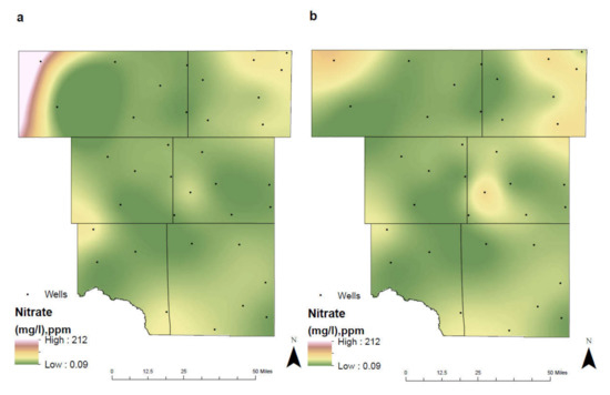Spatial distribution of nitrate in the study area for (a) 1992–2005 and (b) 2006–2019.