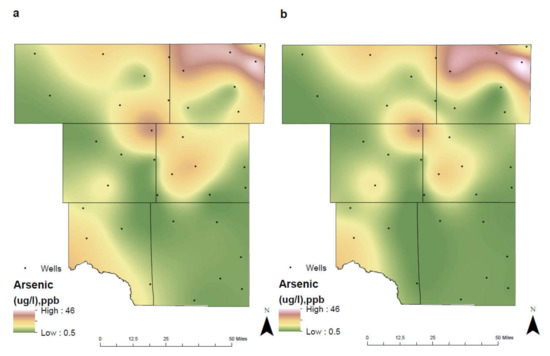 Spatial distribution of arsenic in the study are for (a) 1992–2005 and (b) 2006–2019.