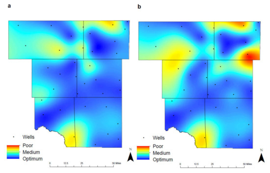 The maps of total groundwater qualities demonstrate the changes that have occurred in 1992–2005 and 2006–2019 (Figure 11), identifying areas where additional environmental studies or regulatory practices could be implemented to improve overall water quality. Between the two separate time intervals, there is a moderate decrease in the amount of optimum groundwater quality within the study area. The two regions of notably poor quality are in Eastern Martin County and Northwest Ector County. This decrease in overall groundwater quality is attributed to the elevated levels of TDS and chlorides associated through anthropogenic activities. Within the city of Midland, groundwater quality has remained consistent throughout the time intervals with medium contaminant concentrations being observed. Odessa has experienced a slight decrease in groundwater quality due to the result of population growth and urban development. Table 5 showed the average of all different parameters in the study area for (a) 1992–2005 and (b) 2006–2019.