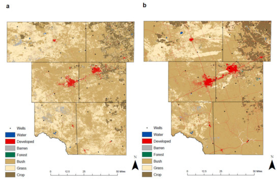 Numerous studies have been conducted to identify the effect of oil and gas production on environmental changes. Unconventional oil and gas production provides a decreasing trend of groundwater quality (chloride, nitrate) over time in the Permian Basin, West Texas [5,6]. The land-use changes in West and Central Texas during the shale boom of 2008–2012 are a direct result from the utilization for unconventional reservoirs and the development of energy resources and other human contributing activities [7,8]. Previous studies [5,6,7,8] have suggested that oil and gas development affected various entities, including groundwater quality and land-use changes. However, few studies have combined both groundwater and land-use factors to identify how oil and gas development related to the environmental changes.