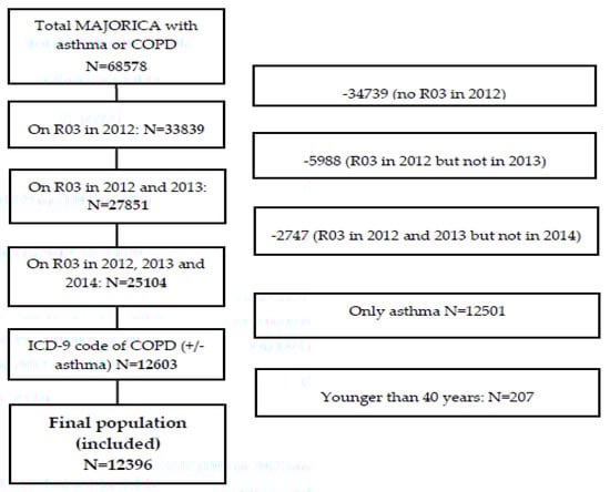 Study population: Among the overall MAJORICA-cohort, patients who were using respiratory medication (ATC (Anatomical Therapeutic Chemical) code: R03) in 2012, 2013, and 2014 were firstly selected. From the included sample, all patients who had a physician diagnosis of COPD (ICD-9 codes: 491, 492, and/or 496) and were over 40 years of age were identified as patients with actively treated COPD.